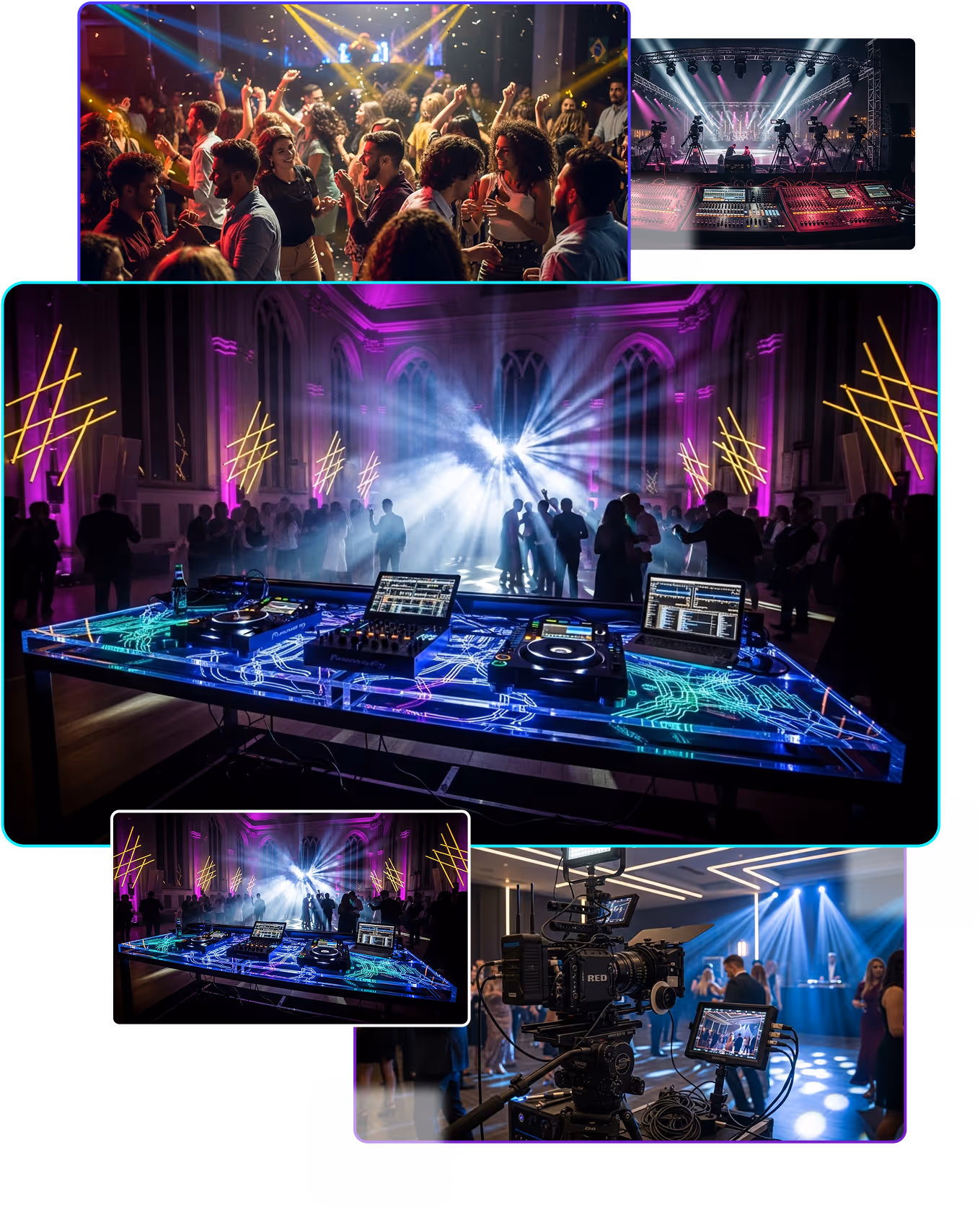 Oferecemos som de qualidade, iluminação personalizada e imagens que capturam a essência de cada momento. Sua festa, com emoção e impacto do inicio ao fim.